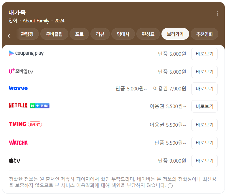 - 동시 서비스 플랫폼: 쿠팡플레이, 웨이브, 왓챠, 애플TV, U+모바일tv 등