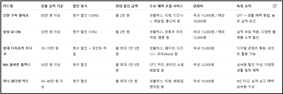 2. 주요 카드별 OTT 할인 혜택 비교 🧾
