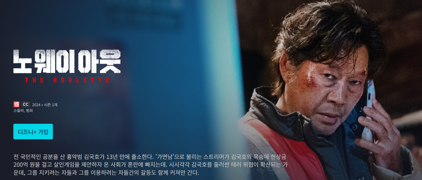 노웨이 아웃: 더 룰렛은 2024년 7월 31일 디즈니+와 U+모바일tvU+모바일 tv에서 동시 공개된 액션 스릴러 드라마입니다.
