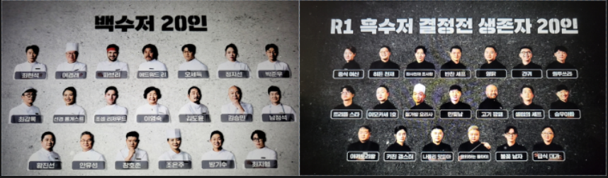 - 백수저 셰프: 최현석, 최강록, 정지선, 여경래, 파브리 등 미슐랭 스타 및 유명 레스토랑 오너 셰프 20인.