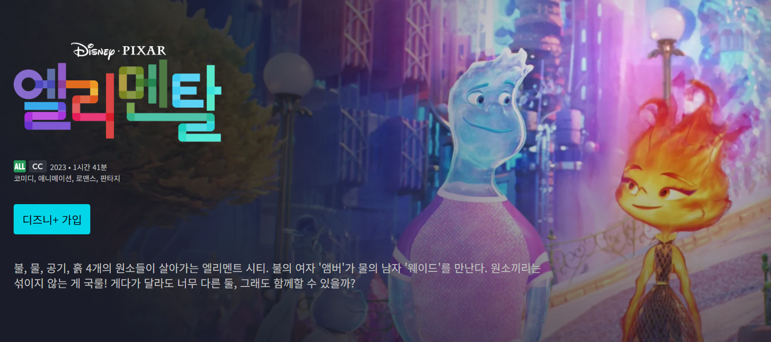 불, 물, 공기, 흙 등 네 가지 원소가 의인화된 세계 ‘엘리멘트 시티’. 이곳에서 불의 소녀 ‘앰버’와 물의 소년 ‘웨이드’가 우연히 만나 서로의 다름을 이해하고, 진정한 우정과 사랑, 그리고 자신의 정체성을 찾아가는 모험을 그립니다. 서로 어울릴 수 없다고 여겼던 두 존재가 벽을 허물고 함께 성장하는 모습이 따뜻하게 그려집니다.